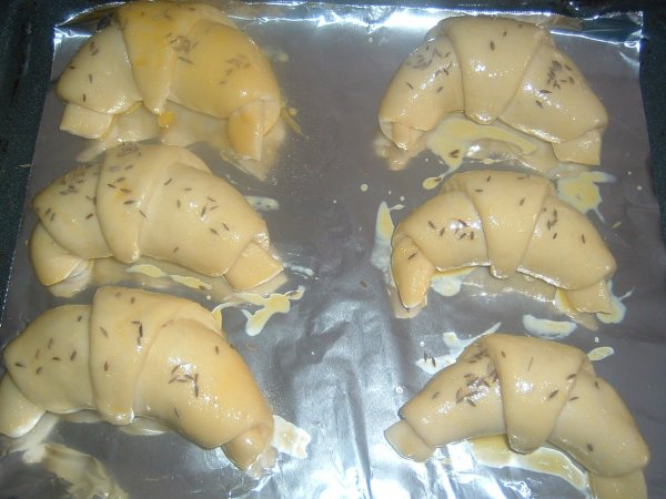 Preincalzim cuptorul la 180C,ungem cornurile cu ou batut si presaram putina sare si chimen(sau susan).Le punem la copt cca.25min sau pina devin aurii.Se iau de pe tava si se pun intr-un vas pe care-l acoperim cu-n servet(se pastreaza moi si nu se usuca).